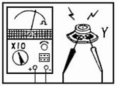 8.测光敏三极管T1,要领见图2-7-11。万用表置Ω档×1K处,黑表棒接T1的正极,红表棒接T1的负极。用手指堵住T1的窗口(玻璃泡),阻值极大。将窗口对着光泽较强处,阻值敏捷变小,只有几K。