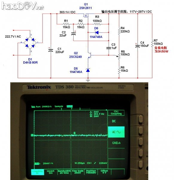 这是刚完成的采用低压(16V)稳压二极管的胆石混合宽范围调压稳压胆机电源,整流管则采用软开关高速二极管BYW96E,其整流特性接近胆整流,开关噪声很低,比1N4007或FR和BYV等普通或快恢复整流二极管优秀得多。这个电源电压调整范围宽,稳压性能优良,输出波纹低,而且调整胆选择灵活。用在WCF和J版胆前级非常适合,有兴趣者可以一试。 稳压管D3的选择范围可以很宽,10~20V/1W的都可以。但要注意的是,当选择的稳压管稳压值在14V以下时,R5要由12K改为8.2K,不然有可能R4调到最小,最大稳压输出都达不到360V。 这是改进电路,比原电路更简单,性能更好,输出波纹更低,调压范围也更宽。如果调压电压范围不需要那么宽的,变压器次级的交流电压也可以降低,只要保证输入[A] 点 / 输出[B]点有100~150V左右的直流压差就可以,这样电源的效率也得以提高。 ![]() 1N47xx系列稳压管datasheet : ![]() #p#分页标题#e# 再给大家一个全晶体管电路,波纹也很低。有兴趣的可以试做 线路图及实做样品输出波纹实际测试 ![]() 实做样品 ![]() 在220VAC输入时的带3K/50W负载实测调稳压范围 ![]() ![]() |