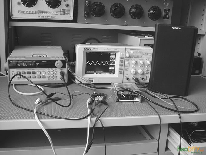 测试与评估 不同于以前的制作,这回笔者借助各类仪表对这款功放进行了测试,并做出了一些肤浅的评估。图5为测试现场实拍图,以下的测试数据的测试条件为:电源电压12V,负载为阻抗6Ω。
