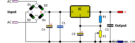 这是一个小的稳压电源电路,使用LM317制作的电路,输出电流1安培,输出电压在1.5伏和35伏之间可调。你只需要添加合适的变压器即可。该电路有热过载的保护,因为在IC包括限流和热过载保护。