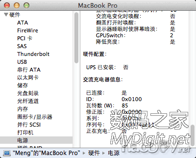你打开 Mac 的 “系统信息”,在硬件栏里也能看到当前所接的 MagSafe 电源的信息,就是通过中间那个触点从电源自带那颗芯片传过来的。