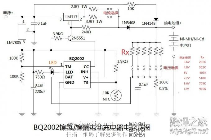 之前用美信的DS2711制作了一个镍镉/镍氢电池充电器 可见这里:http://bbs.mydigit.cn/read.php?tid=538292 用了一段时间感觉很不错,但是这个充电器有一个致命缺点:它只能给单节镍镉/镍氢电池充电,对于打好包的电池组就无能为力了 而手上又有很多镍镉电池组和镍氢电池组,种类五花八门,于是也打算为它们做一个合适的充电器 构思了一下,这个充电器应该能够满足以下要求: 1.能够根据需要选择输出电压,以便适合不同组合的电池 2.电流可调 3.充满自停,不能过充电 4.最好采用负Δ电压(-ΔV)检测方式检测电池 5.电路要简单,成本要低 最初计划用TEA1100或MAX712来完成这个制作,但是跑了一圈市场后发现MAX712停产,TEA1100就根本没有,再搜罗搜罗发现了比较合适的 BQ2002芯片,德州仪器出品。 按手册介绍,BQ2002可以对单只或多只镍镉/镍氢电池充电,可自动完成快速充电,补足充电,涓流充电;可以靠检测-ΔV,最高温度,最长时间,温度变化率的方式结束充电。当电池接入时,芯片会先检测电池温度和电压,如果温度和电压超出极限了,芯片会先对电池进行涓流充电,待电池温度和电压都符合要求后开始快速恒流充电,当电池达到终止快速充电标准后,转为补足充电,以快速充电电流的1/18对电池进行补足充电,直到定时器到点,转为涓流充电。充电速率,补足时间都是可以设置的,而且还有一个功能就是当电池刚刚接入后,为避免接触,电池不良造成误差,在刚开始充电的一段时间内是不会检测-ΔV的;但是这个芯片也有一个缺点,就是他是一个快速充电器芯片,它的最慢充电也是以0.5C的电流充电。 这个芯片还好没有停产,北京市场上没找到,说得从深圳发货,正好有个哥们去深圳出差,就劳烦他一下,还真有,让他带了3颗BQ2002回来,还好不是很贵,10元1颗,相比35块钱的DS2711已经够便宜的了。 设计电路,这个充电器的电路是在BQ2002的参考设计上改动而来,具体功能如下: 1.电压可调,共分6档,分别适应3.6V(3节)、4.8V(4节)、6V(5节)、7.2V(6节)、12V(10节)还有待定电压的电池组 2.电流可调,3档,分别是0.3A,0.6A,0.9A,以适应不同容量的电池 3.采用检测-ΔV方式判断电池是否充满 4.具有温度检测功能,随时监测充电中的电池温度,避免电池过热 5.快速充电,充满电只需要160分钟 6.既支持交流输入,也支持直流输入 7.较宽的工作电压,目前是7V-18V内都可以正常工作 8.电路简单,采用廉价的LM317做恒流 9.采用精密金属膜电阻作为电池电压采样用 货还没到,先制作出PCB来 ![]() 还是采用热转印的方式 ![]() 腐蚀过后 ![]() 钢丝球刷掉碳粉,打孔,涂上一层松香水做保护 ![]() 芯片到了,本来想着是直插的,不曾想他给我买的贴片的 板子都做好了.......只好转接板了 ![]() 备料!全家福 电池采样电阻采用的是RJ-14型精密金属膜电阻,精度0.5% 其余就是普通元件,LM317还是拆机货,这些都无所谓 ![]() 开始码件,还是先从最矮的贴片元件开始,这时候元件面没有任何 元件,PCB板可以平稳的放在桌面上焊接,如果先焊直插元件, 焊贴片时板很容易不稳当 ![]() 焊完贴片焊直插,先从最矮的开始 ![]() 继续,开始高一点的 ![]() ![]() 焊上恒流用的LM317 先测量恒流是否正常 第一档,低电流0.3A ![]() 高电流档,0.58A ![]() 最大电流,0.87A ![]() 恒流电路正常,又检查了一下給芯片供电的5V电源,也正常,就可以焊上芯片了 这是做好的模样 还有一个滤波电容暂时不焊 调试阶段,电池采样电阻只焊了两档的,支持给4.8V(4节)和6V(5节)的电池组充电 ![]() PCB背面 ![]() 这是制作完成的充电器 ![]() ![]() 先拿几个电池出来,4.8V 900mAh的镍氢电池组 ![]() 充电中,电源是用的12V 1.5A开关电源,充电电流选择0.3A 黄灯亮起表示正在进行充电 通过电流表测试,充电电流是0.3A 由于LM317是线性的,所以效率比较低,因此,电源电压不能和电池电压相差 太大,像12V电源,充3.6V-6V电池都合适,要充7.2V电池的话,电源电压就得15V了 大量电能变成了热通过散热器散走了,0.3A电流下,LM317的散热器 是温热的,手可以长时间停留 ![]() 下面是电路图 电流和电压通过跳线设置,非常方便 ![]() 调试:由于目前刚刚制作出来,所以调试还在进行中,目前已经对2组4.8V 900mAh镍氢电池组完成了充电,充满后,LED熄灭,电流为0,手摸电池是温热的;由于BQ2002的DataSheet内容较少,尤其是对温度检测方面没有详细描述,这给温度检测器件的选择带来了些许困难,自备的几种NTC均不适用,还得等晚上调试。 最终调试:仔细查看了DataSheet,貌似对于温度检测元件没有特殊要求,但是BQ2002是温度检测引脚TS电平在1/2Vcc+-0.5V时进入保护状态,也就是正好和DS2711相反,而按照DS2711的接法,就算是室温,BQ2002也会认为温度不符合要求,因此停止充电,既然知道了,问题迎刃而解。 原手册要求热敏电阻用石冢的103AT-2型负温度系数热敏电阻,这和DS2711要求的型号一致,但是这个型号实在买不到,虽然用的也是10K的负温热敏,但是不知道温度系数曲线也是麻烦事。 这是自制的温度检测线 ![]() 按手册介绍,和NTC串联的电阻应该是3.57K,先在原先的10K电阻上并联一个5.6K的,正好是3.58K左右 ![]() 效果很好,接上电池,用烙铁靠近热敏电阻,很快充电指示灯熄灭,充电停止, 没有热敏电阻特性曲线,就不知道具体保护温度是多少,但用手感觉是温热的感觉, 看来温度检测的问题解决了,应该不会造成电池过热 另一个问题是不接电池时电路也会进入快速充电模式,经过检查发现是线路设计错误 空载时