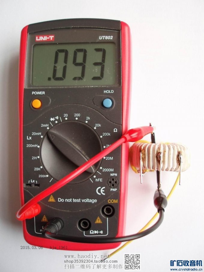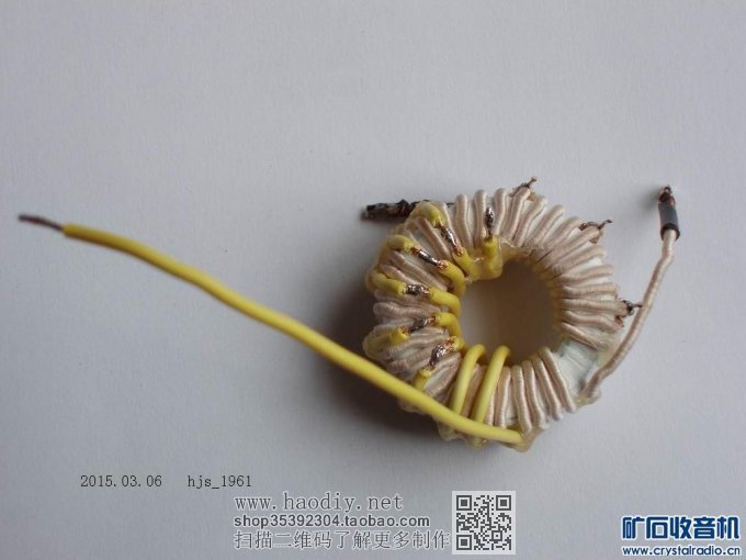 4、磁环线圈,高Q磁环R40C1上用0.04x660里斯线绕37匝作为谐振线圈,电感量93uH,在3匝、7匝、11匝处抽头。谐振线圈外侧用1.0平方的电线绕8匝作为天线线圈,在1匝、2匝、3匝、4匝、5匝处抽头。