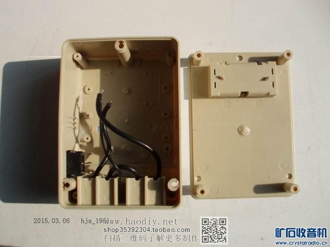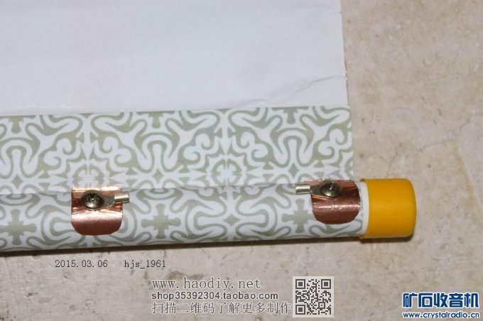 10、线圈由三层组成,中间一层铜箔粘贴层,两侧为装饰层,最后引出接线端。 11、支架组合 12、画轴铜箔天线组合完成 13、光线下铜箔隐约可见 14、再测电感量 接收机制作流程 1、机壳采用损坏的液位控制器外壳 2、可