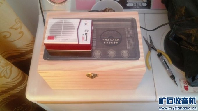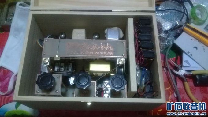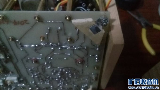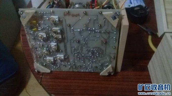 (责任编辑:admin)国产直流电子管收音机主要有上海451、长江125等型号。这类收音机由于要使用电池供电且能量有限,有些地区不易买到供电专用的乙电池,而交流电源使用起来则更为方便,因此直流电子管收音机在技术发展的过程中多数被改造为交流收音机,残存下来的寥寥无几,以至于很多电子管收音机书籍中都无直流电子管机器的相应资料。所以本次DIY大赛设计的参赛作品为一台木盒式四灯三波段电子管收音机。 考虑到成品电子管机器多数为超外差式,因此本机也设计为超外差式。超外差式收音机通常包括变频级、中放级、检波级和低放级四部分,由于直流电子管机器的设计理念之一是节约电能,电子管数量不能过多,常见电子管机器一般为四灯机或五灯机,这里选择一张嘉陵江四管机图纸进行设计。 ![]() 本机电路图。 本图纸为二波段机器图纸,本机在该图纸基础上增加一个波段,即更改短波部分,增加一组天线线圈和震荡线圈。 二、工具材料准备 工具准备:外热式20W电烙铁一把、手电钻一套、电路板制版转印机、腐蚀塑料水槽、螺丝批及刀具、信号发生器、万用表等。 材料准备:覆铜板、热转印纸、打印透明不干胶纸若干、有机玻璃板、薄铁皮、螺丝桩若干、适当尺寸木盒一个(本机选择24.5*16.5*13CM尺寸)、薄松木板及薄纤维板若干、焊锡丝、线材、常用阻值1W功率电阻若干、常用容值电容器若干、半可变电容器若干、LT100系列K式调感线圈、电子管座、312-3/4电子管机中周、旋钮、9V电池扣、1号电池架、电位器、双联电容器、输出变压器、扬声器等。 电子管型号:1A2、1K2、1B2、2P2。 三、制作过程 有了计算机软件辅助制图,本机未采用传统电子管机常用的搭棚焊安装方式,而用计算机辅助制作印刷电路板。 然后是印刷电路板制作,本机采用热转印制版,转印制版和切割打孔过程没有拍图,最终做好的印刷电路板如图所示。 ![]() 电路板实物图 本机的印刷电路板共有五块,分别是主体电路板、刻度盘背板、波段开关支架板、调谐旋钮支架板、音量电位器支架板。主体电路板尺寸根据木盒尺寸确定,为16*19CM,三块支架板根据旋钮内部件的尺寸确定,为5*4CM。 刻度盘背板根据调谐拉线盘尺寸计算确定。本机选择使用直径7.2CM调谐轮,双联电容器转动范围共有半圈,因此刻度盘有效长度为调谐轮半周长11.3CM。其上印制矿坛logo,为比赛量身定制。 首先完成部分配件的组装过程,将三个旋钮部件的支架板与铜柱组装起来,形成三个旋钮模块部件,铜柱的总高度根据木盒的深度和主电路板的安装高度确定。 ![]() 部分部件 接下来完成主电路板的焊接工作,首先焊接电阻电容等小体积部件,然后焊接电子管座等部件,最后安装双联电容器和调感线圈部件,其中101K线圈采用101S线圈改制,在原有线圈外部另绕40圈作为回输线圈。机芯主体部分安装完成之后安装三个旋钮模块部件及输出变压器,然后连接扬声器。 ![]() 部分组装 本机沿用原始图纸的1.5V甲电和90V乙电,将10个9V电池扣串联组装后对接头绝缘处理并与乙电插头连接,将两个1号电池架并联后与甲电插头连接。 对电路板的焊接及部件规格多次进行检查,无误后插接甲乙电源,打开开关开始进行测试工作。 ![]() 乙电池扣 首先调试低放部分,只安装1B2检波管和2P2功放管,使用手机作为信号源,从音量电位器中点注入信号。经测试,低放部分工作正常,以下是测试视频。 低放测试视频链接 http://v.youku.com/v_show/id_XNjcxMzIyMzA0.html 低放部分调试正常后开始逐级调试。先尝试信号接收,将波段开关置于中波,旋转双联电容器转轴,全段无台。用螺丝刀碰触双联震荡连定片,有喀拉声,将调整好的晶体管收音机置于震荡线圈附近,调谐接收,有较大噪声,说明本机震荡已经起振,但频点不对。根据超外差收音机原理,将晶体管收音机频率调整为990KHZ,旋转本机震荡线圈磁芯,使噪声最大,本机震荡频率已调整为465KHZ。因此存在的问题是中频不准确,需进行统调。 首先调整中周,使其处于465KHZ频率上。调整方式采用本坛白版主的方法,即短路输入中周F端,使自动增益控制AGC失效。信号源调整到465KHZ,接入简易等效天线,从天线端注入信号。使用无感改锥从输出端次级开始旋转中周磁芯,使信号源发出的音频声最大,至此中周已调整准确。去掉短路的连线,恢复原始电路。然后进行机芯测试。其中信号低端通过旋转天线输入线圈磁芯调整,高端通过调整垫整电容来进行。 ![]() 调整机芯 以下是测试视频。 http://v.youku.com/v_show/id_XNjcxMzI4MTI4.html 然后制作扬声器挡板。本机未设计外置扬声器开口,声音为木盒箱体共振发出,所以扬声器为内置挡板固定。选择一块15*15CM的薄松木板,在机芯上比好位置后划痕确定开口大小,用勾刀切掉松木板开口内多半的厚度,打孔,安装螺丝桩,根据木盒的深度确定松木板保留的高度,其他部分切掉。将扬声器安装到开口内部。 ![]() 木板料 ![]() 挖孔 ![]() 切割 ![]() 安装 设计一套可行的调谐拉线系统,DIY几个滑轮架固定到刻度盘背板和调谐旋钮及调谐轮附近。 ![]() 滑轮支架 ![]() 拉线系统及整机安装示意图 由于选用的带开关电位器开关用作甲电开关,此处需DIY一个简易的乙电开关。开关选用街机按键开关,用薄铁皮做个简单支架固定到音量电位器支架板上。 ![]() 乙电开关和支架 根据机器的频率范围设计制作有机玻璃刻度盘