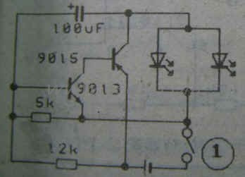 当前,各中学、小学都开展了科技勾当课以进步门生的下手手段。本站先容的这个闪光灯小建造是实践通过的,能开导学上对电子技能的乐趣。 1、建造原料 3DG6(或9013)一只,3AX31或9015一只,12K电阻一只,100UF电解电容一只,印制板一块,5号电池两节,发光二极管2只,2X1小开关一只。 2电路简介 图1所示电路由两只极性相反的三极管构成互补多谐震荡器,接通电源后电畅通过12K电阻向100UF电容充电,到一按时辰,晶体管9013导通,同时9015也导通,使发光二极管发光。电容放电,使9013基极电位降落得不到正常偏压而截至,发光二极管不亮,周而复始 ,闪光不绝。5K电阻起掩护晶体管浸染。 3建造 起首把2厘米宽4厘米长的敷铜板用断钢锯条划成四条铜条,第二条中间在划断,按图2打好17个直径1MM的孔,然后用细纱纸把电路板打光上好锡,将元件按图所示位置焊好,防备虚焊。 4调试和建造外壳 建造完成后先通电试一试,若不发光也许是发光二极管接反,可把两尽管脚对换一下。若各元件脚都焊对了,看有无虚焊。若发光二极管亮而不闪,也许是12K和5K电阻接错,应把它们对换过来。 当发光管正常闪光后把它装在硬壳香烟盒里,并在烟盒上打两个孔,使两只发光管凸出。并在烟盒上粘贴一张彩色小猫的头像。两只发光管正亏得眼睛上,通电后猫眼一闪一闪发光,很风趣。