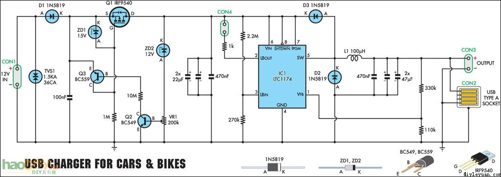 寻找一个USB从12V汽车电池充电器,能有效地运作?该器件工作在89%的效率,可以为USB设备充电在电流高达525毫安的。最重要的是,它会不会面临永久连接你的电池,只要你记得拔下USB设备。 USB充电器在市场上有很多,但这个USB充电器有两个功能:在待机状态下的高效率和低消费。事实上,他的待机电流只有160μA,这个数字是远远低于大多数铅酸电池的自放电。它不会导致电池走平(或至少不会比它快得多本身)。