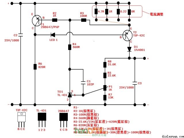 此电路可以调整1A、500mA、300mA、100mA的电流输出。利用4段开关切换。电压输出12.7V。改变R5\R8\R11的电阻值,可以改变电压输出多少。 (责任编辑:admin) |