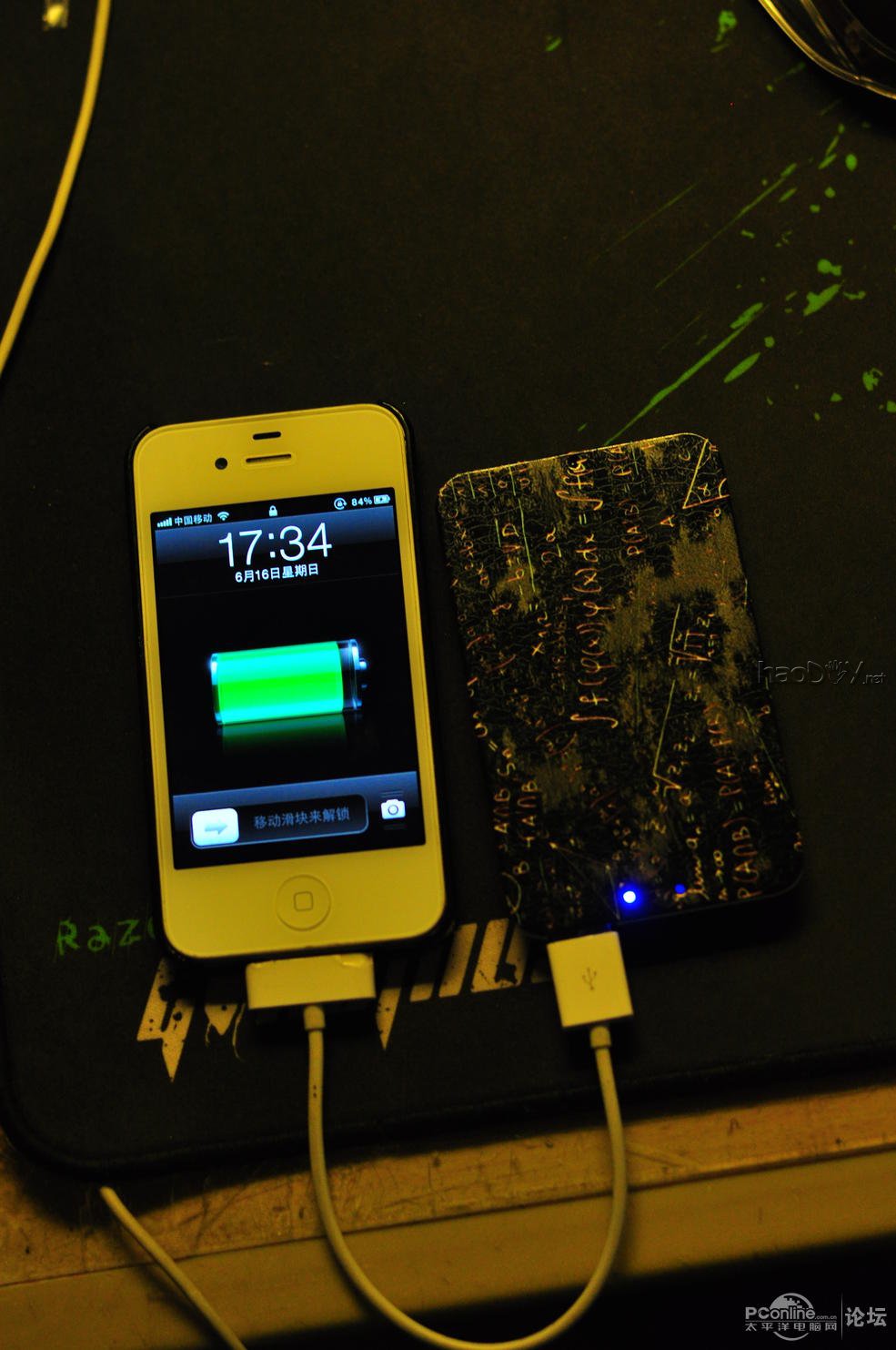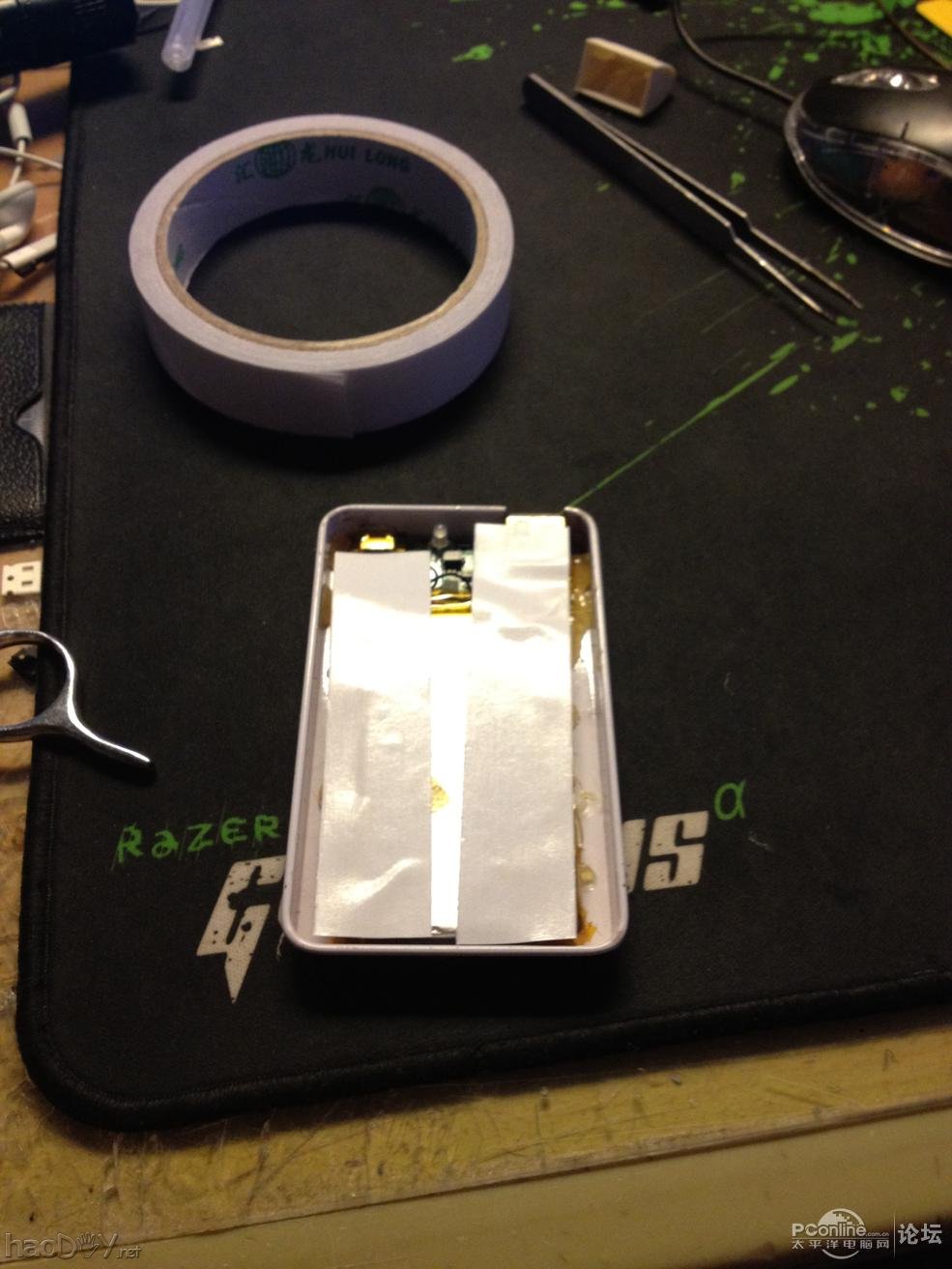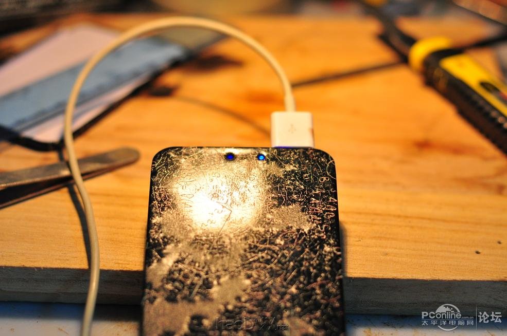 潜水已久,今天来发个自制的移动电源 虽说已经不是第一次做这个了,但是我这个很轻很薄哦! ![]() 这个是成品图 ![]() ![]() 先上个工具,打磨钻,钢锉,小刀,升压板,聚合物锂电池,很有一个盒子(由于中途才拍照,所以拿了另一款盒子代替合照) ![]() 把盒子用胶布包着,免得开孔的时候刮花了 ![]() ![]() 就这样,吧USB输出插口给开出了一个大口 ![]() 然后开一个micro usb ![]() 由于只有1mm的钻头,所以先钻几个孔,再用钢锉把它锉出形状来(就是这里比较麻烦) ![]() ![]() 开孔以后用小刀吧多余的铁屑刮走 ![]() 好了,转移阵地 这是升压板和LED,虽然效率不高,但是也能冲IPHONE2次 ![]() ![]() 把它们都焊接好了,测试,OK! ![]() ![]() 输入 ![]() 输出 装上去,打一些热熔胶 ![]() 对准LED的位置,在盖上面钻两个孔 ![]() #p#分页标题#e# 就这样亮了 ![]() 盒盖了!拿出两公分宽的双面胶!这样做是为了以后能方便拆出来 ![]() 好了!做好了!配上一条短短的线 ![]() ![]() 谢谢大家观赏