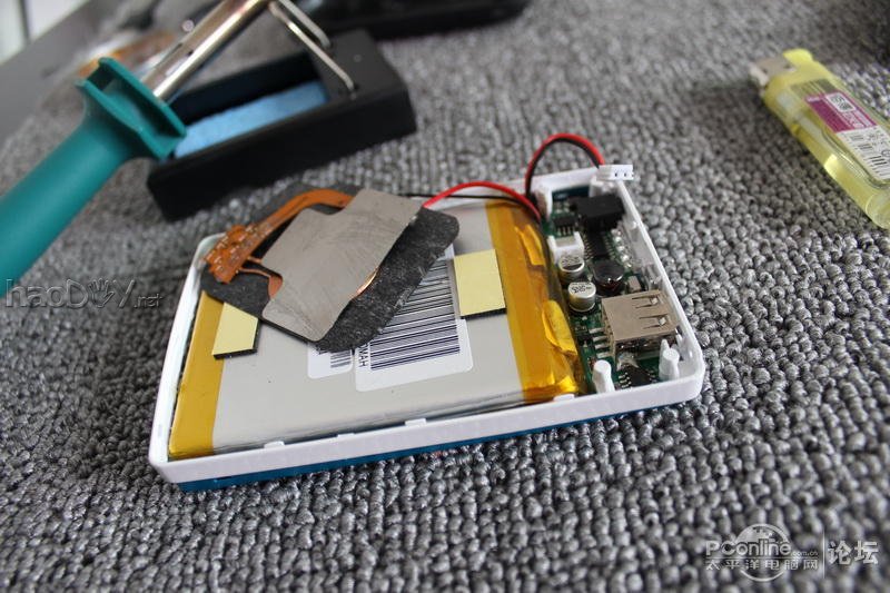 看见不少筒子把三星i9250加装无线接收线圈后改成像Veer一样使用点金石充电后,我不由的内心蠢蠢欲动。手头上正好有一个二奶机Veer,所以石头充电底座什么的都是现成的,缺少的只是一个无线接收线圈而已。 当然,把主力机改成像Veer一样无线充电的方式现在已经弱曝了,因为有N多胸弟姊妹蜀黍们已经改装手机成功了。假如我要改装的话,当然要改装大家没改装过,这次改装对象是主力机用的力众移动电源。我想应该还没有人改装过吧?~那么~我这应该是全球第一台无线点金石充电的移动电源了吧!!哈哈~ 下面开始进入电工模式~ ![]() ![]() ![]() 这就是大名鼎鼎的Veer及其无线点金石充电套装,相信很多像我这样的电工宅男已经见怪不怪不了 ![]() 这次动工的主体---力众续航大师三代商旅版移动电源,一直是另外一部主机手机的续航后备,现在要把它改装成和Veer一样用无线充电。 ![]() 充电底座是现成的,但是还少一个充电线圈。这个是网上淘来的HP Plam pixi plus后盖。 ![]() 其实Veer无线充电原理很简单,就是电磁波感应原理:无线底座的线圈连接有线电源产生电磁信号,手机后盖上的充电接收线圈通过感应发送端的电磁波信号产生电流给手机电池充电。 现在我就是要把Plam pixi plus后盖的无线接收线圈拆下来改装到力众移动电源身上,实现力众移动电源的无线充电。 ![]() ![]() 从Plam pixi plus后盖的拆下的无线接收线圈:开始很心急,动作很生疏,差一点就把线圈搞断,幸好及时的调整状态,小心翼翼的拆了下来,慢工才能出细活啊~ ![]() 然后从家里的杂物箱子里淘出了两根小导线,用来把无线点金石线圈的正负极桥接出来。通过咨询和查资料,确定了线圈上远离线圈的一端是正极,近的一端是负极。 ![]() ![]() 出动洛铁、锡丝和松香把无线接收线圈的正负极桥接了出来。~好久没动烙铁了,出来的成品貌似很渣,呵呵,毕竟不是专业人士啊~有空得多练练 ![]() 把接好的线圈手工DIY到原来的贴纸上,待会再把另外的正负极接到移动电源上。 继续~移动电源拆解 ![]() 找了很久,才发现前面显示电量及接口部分是可拆卸的挡板,拆了下来,然后拧下螺丝,就把续航大师商旅版拆了下来 ![]() #p#分页标题#e# ![]() 第一次拆力众的移动电源,发现做工还可以,而且内部聚合物锂电芯还做了很好的电路保护。 ![]() ![]() 把电芯也拆下来,准备接导线正负极到移动电源PCB板上。 ![]() 找准位置,接的对象是这两个PCB板上的电池正负极上 ![]() 继续电工动作,唉,发现用烙铁真的是一门技术活,别看改装原理很简单,但到了真正DIY过程中,烙铁应用并不是很顺手,因为PCB板很小,只能打起十二分精神小心翼翼的焊接 ![]() 然后是一系列的重复动作,接正负极线理好,放好移动电源电芯 ![]() 再把这一边对着续航大师后盖上,因为加了线和无线接收线圈的原因,费了好一会功会才把移动电源合上。 ![]() 继续,把移动电源螺丝装好。 呼,终于把这次改装完成了。原理真的很简单,但是DIY实施下来,发现要很大的耐心、精力和时间,而且这次使用烙铁不熟手,还好没有把头发烧了,哈哈~希望改装能成功吧,看看成果先 ![]() 拿出Veer的石头,把移动电源放了上去,通电之后,充电指示灯亮了,果然力众续航大师无线充电改装成功了~ 哦也哦也,超级happy哇,,虽然不是很难的DIY,不过自己体验下来还是相当的酷、相当的爽,相信众DIYer会理解我的心情的,就这样,第一台无线点金充电的移动电源诞生了
