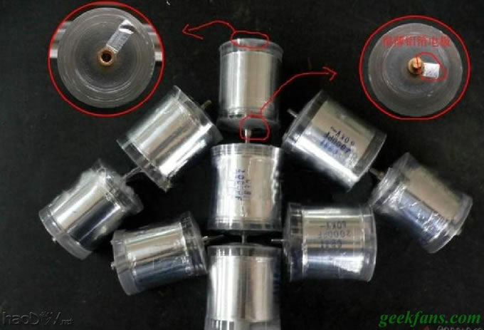 这种是静电电容,电极都是从卷膜两端引,与平凡薄膜层层引镀对比,ESR,ESL何止大出10倍,拿来玩玩马克思也就算了,它灼烁硬朗的外表简直轻易米糊人,下图的还带螺栓呢,只痛惜其首要目标不是用来过电流,仅仅做为两个电容毗连之用,引到螺栓上的电极薄如纸...... 5.油浸电容 微波炉电容