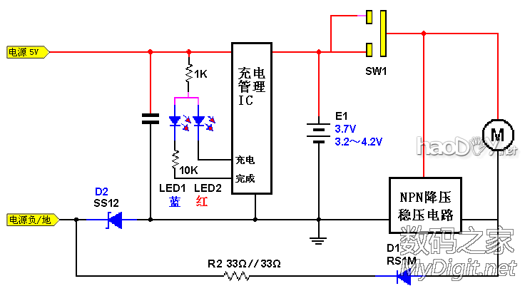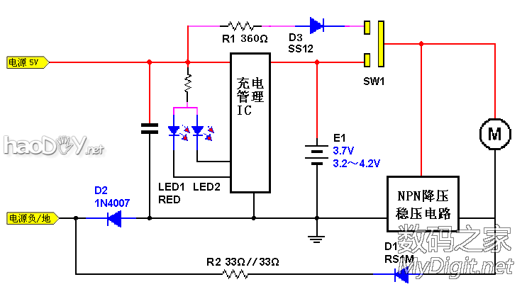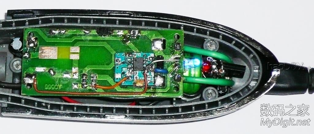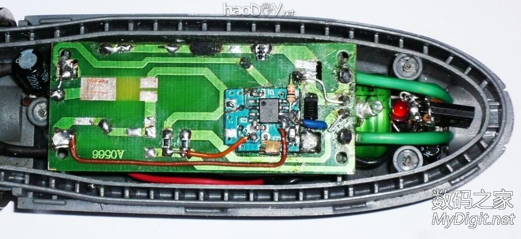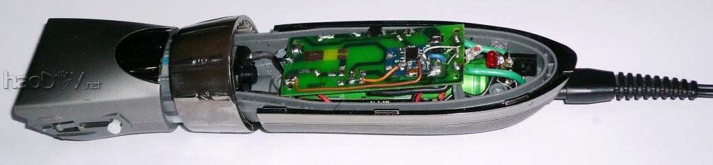 如何用锂电池替代1节或2节传统电池,同时较好地解决电压匹配、效率问题以及电路难度困扰? 本帖及后续帖将推出易于DIY的、适用性好的最简分立元件开关DC-DC电路,从此一扫往日烦恼。本帖是示例之一。 先介绍本帖主角。2010年买的KAIRUI防水电推剪,比较有劲,不过噪声也偏大。新机时并没有拍照,这是借用网上的图: ![]() 是成套的(本帖无意做广告),内置充电电池,可充电的: ![]() 插上充电头即充电,会亮起红色指示灯: ![]() 用到现在外壳有些掉漆,不过刀头依然锋利。以下是本人用卡片相机实拍的图,效果虽然有些勉强,但风格还算比较配套: ![]() 由于只是自家用,每个使用周期中闲置时间较长,每次用后如果充好电存放,下次取出要用时却是差不多没电了,电池自放电较大,只好现充现用,比较耽误时间。 电池越来越不行了,充足电也支撑不够一次使用了,换吧。拆开看看,原来是用2节AA镍镉电池串联的,容量只有600mAh。这容量是按每个头15分钟设计的?下图中的电池就是从里面拆出的: ![]() 手中有不少AA充电电池,其中有几节稍旧的超霸(GP)镍氢电池,每节容量是2400mAh。想想这电力容量每次够变幻几个发型用的,超耐用有木有?且同是AA,能保持原滋原味,就换上了。换后内外观没什么变化。 ![]() 不曾想,由于旧镍氢电池有较大的自放电,每回取出使用时,电机竟然都是难以启动,需要插上充电头现充电很长时间才能缓过劲来(充电头没有升级扩容是主因),然后越用电越足——这么久的前奏也太捉弄人了吧!看来还得换,着急理发用,直接换成锂电吧,来个终极解决。 先抄出原来的电路图(这是后来整理的,就不显摆当时手画真迹了): ![]() 图中二极管D1原为RS1M,实际与1N400X相当。 再拆开,去掉里面的一个用于原来电池定位的塑料立筋后,里面空间恰好能放下一节18650电池,再给锂电加个条状的保护板,还是很合适的。简单劳动,过程就不上图了。这是换电池后的样子,电池是绿皮的: ![]() 试通电,锂电池电压太高,电机疯转,有点吓人。这样肯定不行,需要降压,最简单的办法是串联二极管。先串一只1N4007试试,电压还高、速度仍快,于是串了二只,差不多了。增加的两只二极管串接在电机的白线上,图中电路板下有1只,只能看到1只。实物如下: ![]() 部分元件和节点标示一下: ![]() 捉急理发,就先装好、这么样用一次吧~~实际使用效果还是很不错的。 原来的充电头没劲、不能用了。主要是不喜欢那个欧式插头,就不对这个充电头进行改造了。充电头已拆过,详见拆机帖:http://bbs.mydigit.cn/read.php?tid=1088426 ![]() 电推剪的充电插头是专用形状的,还得保留。锂电要充电,就把原来的充电头剪线了,只用线及插头。线的另一端与一个联想鼠标的优质USB线对接,改成USB插头线了。改线时需要注意正负极性不可接错。这样可以与5V的手机充电头共用,统一了不仅方便,同时电力充沛,可以边理发边充电,不需再担心里面的电池没电了。 ![]() 在加装专用充电芯片之前,临时串联二极管D1降压做为充电电路,这个暂且按下不表。上改造后的电路图: ![]() 这样改后已经很不错了,18650电芯的容量一般在1500mAh以上,已经远高于原配电池的600mAh了。不过,这与完美还有距离,至少不如采用LDO好,不能就此止步。那么问题来了:除了要加上自动充电外,降压电路怎么再改进呢? 【楼下继续,欢迎拍砖、砸M】
