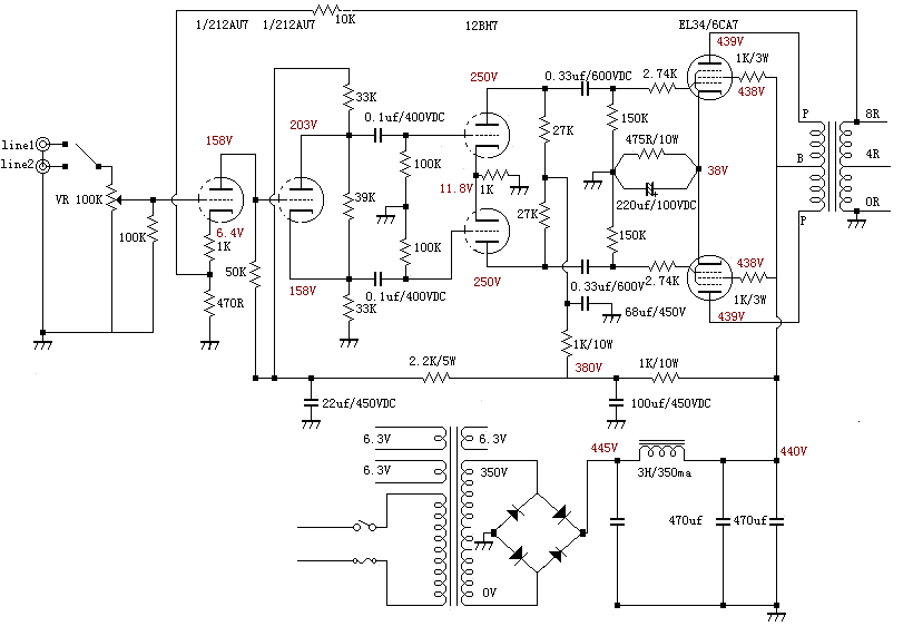 12au7+12bh7+el34(6ca7)电子管推挽胆机线路图