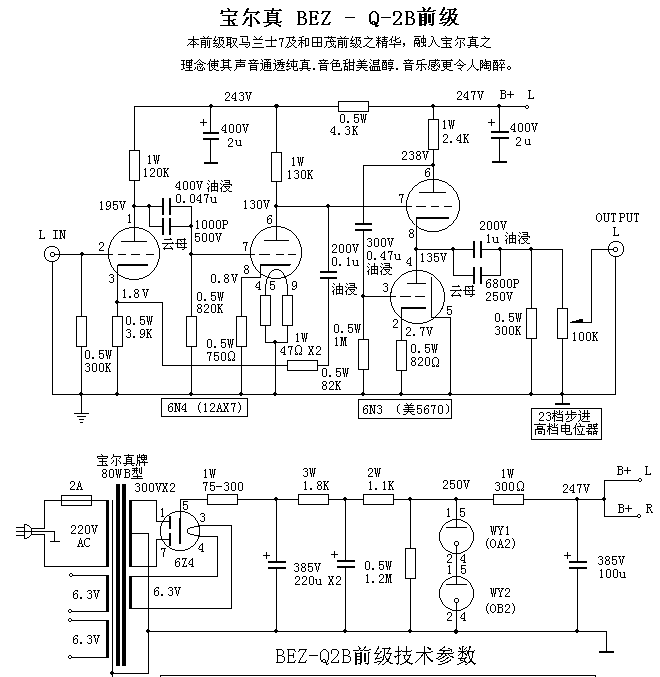 6n4(12ax7)+6n3(5670)电子管胆前级线路图