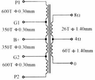 要求推挽放大管两组屏极负载回路应完全对称,超线性输出变压器要求以B+为中心端,将一次侧线圈分为P1与P2两组,每组各分成3段,上下相同,相邻放置,同方向绕制。并将二次侧线圈分为3段,夹绕于一次侧中间,这样输出效率高,频响特性好。