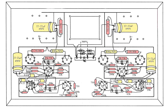 在通用底板上先将各种开关、电位器、接线支架、输入与输出接线端子、电子管灯座等小零件逐一装上,陶瓷灯座在安装时必须注意图示方位,这样可以保持接线距离最近。其中电源变压器,左、右声道输出变压器由于体积庞大而笨重,故应该在全部小零件焊接完毕后再安装,因为在安装过程中底板要四面翻动,容易损伤外表。