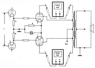 具体的校准方法是,采用直流电流表500mA档,分别串接在功放管的屏极回路内,功放管栅极有音频信号输入时,如果屏极电流升高,则表示该功放管的栅极负压过低;反之,如在有音频信号输入时,功放管的屏极电流随之降低,则表明栅极负压过高。因此,A类功放的屏流变化必须保持在10%左右,如果屏流变化较大时,则表明工作状态不稳定,或已经进入AB类的工作状态之中。