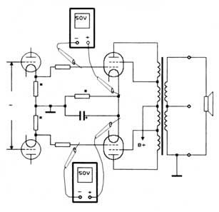 AB类功放级的栅负压调整必须在注入音频信号后进行。功放管的栅极负压是对阴极而言,因此,在测量时应将万用电表置于直流电压50V档上,将负表棒接功放管的栅极,正表棒接功放管的阴极。