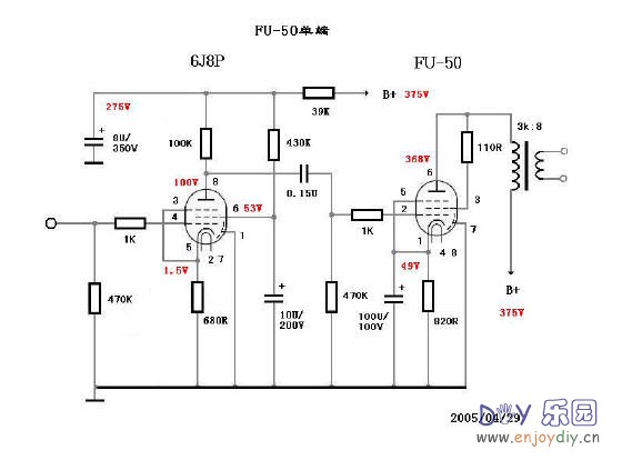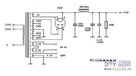 用闲兄的通用单端套牛及铝机箱制作成双单声道分体机,6J8P推FU-50。刚开声,交流声基本上不可闻。相信经过煲机及效声后会有好的表现 内部 电路图。 各电压值为实测值,不知是否正确,请指正。 补上电源图. (责任编辑:admin) |