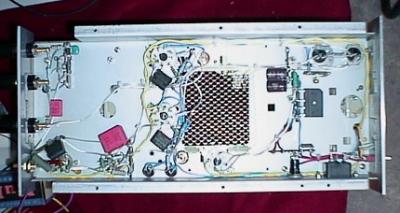 所有变压器绕制好后经过了手工的浸漆过程。因为条件有限,没有办法达到正规变压器厂家的真空加压浸漆条件,所以就用普通工业烤箱将变压器用105度的温度烤3小时后再浸漆,之后再烤三个小时之后再进行一次浸漆,之后再将变压器烤干。这种浸漆的工艺俗称“半真空”。不过只要浸漆认真。也会使用许多年不生锈。以前因为使用较薄的硅钢片制出的电源变压器经常在使用中可以听到(使用木棒,一头顶住变压器,一头再对准耳朵)轻微的哼声。但这次制作比较严谨,即使使用了0.35mm的硅钢片制作出的变压器也只能听到极其微弱的声音。 本机的制作非常严谨,如果零件没有问题的话,调整到这里应该一切就绪了,当然如果其它发烧友在仿制中也会碰到各种各样的问题,那样的话就需要认真解决了。本机的仿制只到这里已基本结束了。第一台机器焊好后再焊第二台就容易多了,照猫画虎而已。最后是给电源与输出变压器罩上一个金属罩,这样的目的是为了减少互相之间的干扰,请看右图,两个灰色的铁罩里面就是电源与输出变压器,在罩子上留下了一些散热孔。这样的目的也是为了使变压器的寿命有所增加。