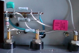 调试过程中出现的另一个问题则是有高频自激声。几次检查都发现不了问题,最后发现是由于两管的超线性接头接反所致,将两管第二栅极与输出变压器的抽头调转位置这个问题也就解决了。在整机调试过程中,开始并没有引入负反馈,但当调好后本机的交流噪声已经非常低。用耳朵贴近嗽叭才可听见一点点交流哼声。当负反馈网络引入之后,则完全听不到任何交流哼声了。这说明原机的负反馈网络设计也是非常精良的。右边的照片为负反馈网络的实际接线图。注意,如果有可能的话,这部分电路一定要远离高压部分,也就是说应尽量减少各电路对这部分电路的干扰。否则的话会在反馈中引入各种不必要的杂波。而且这里的电阻应选用噪声较低的金属膜电阻。虽然它不承载功率部分,但最好还是选用一些功率较大的,例如1/2W或者更大的电阻。因为功率较大的电阻往往受温度影响的噪音系数较低。并且也要保证这部分电路的引线尽可能的短,所以本机在设计时就将这部分电路放在了输出变压器的下面,和音箱的接线柱邻近。