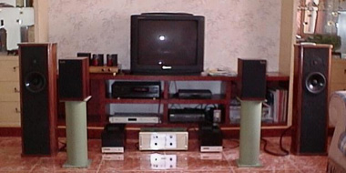 到这里还不算完全完成,最后要做的就是给整机做一个外罩了,把所有的零件全部罩起来。这次使用的是聚脂板切割好之后用环痒树脂粘起来,最后经过打磨,喷漆而成。选用聚脂板做外罩的原因非常简单,就加工容易。制作中留下了足够大的散热孔,散热孔的位置上粘上了丝网罩,丝网罩也要经过喷漆,喷漆时不要一次喷得太多,否则会比较难看,要每喷一次经过半个小时再喷一次,一共要喷三四次才会比较好。图中在中间那台白色金属外壳机器的两旁则是这一对仿制的马兰士Model 8B,因为照片的效果不好,所以没办法完整的显示出这台机器的外壳,总的来讲,这台机器的外型是比较古典式的,完成品的外观是比较庄重,大方。中间那台白色金属壳的机器为仿制的和田茂氏线路前级,以后有机会再介绍。