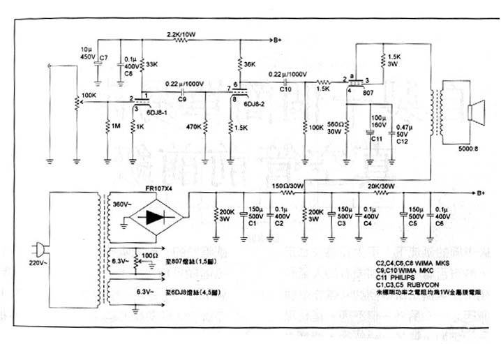 807是一支旁热式氧化物阴极束射四极管,它可以用作高低频功率放大,最高工作频率可达60MHz,以前听过的807胆机都是推挽机,特点是速度快,个性爽朗,分析力却稍差,音色偏硬。如果807甲类工作,情况可能有改观,大家可以试一试单端807甲类胆机。 评价一套音响