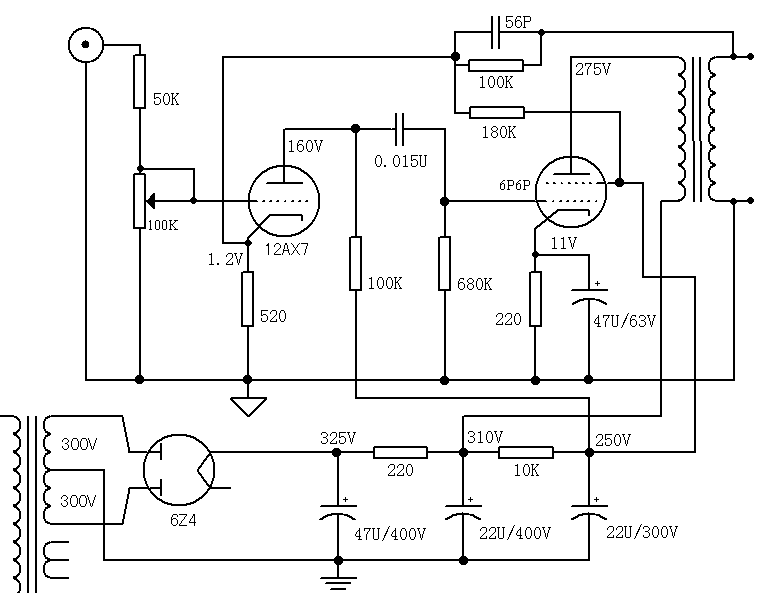 此电路转贴自论坛,感谢各位同学发表评论意见。 映呈: 一台美国机的6V6的单端电路,是我按样机绘出的,数据为实际测试的。 音质很好,样机是一位烧友在美国带回来的,音质特别好,成了当地烧友仿制的样机。 accuphase: 相信你一定见过在输入管的阴极是两个电阻串联,然后靠近阴极那个电阻上面并联一个大的电解电容,从输出变压器次级引来的负反馈加在这两个电阻和电容那个节点这样的电路吧?采用两个电阻串联是为了输入管的直流工作点,而并联电容是为了调整输入灵敏度和增益,这样做的结果是:因为阴极电容的存在,使得输入级的通带放大量不一致,两头低中间高,表现在复平面上是一对极点向虚轴靠近,系统的拉氏变换存在平方项。 如果对整机电路进行微变等效电路分析,画出交流通路,显然那个180K的电阻是并联在520欧电阻两端的,180K比520欧,基本上不影响520欧的阻值,但是180K这个回路存在约1.4mA的直流电流,这个电流流过520欧的电阻,产生约0.7V的偏置电压,加上12AX7自身的屏流,使得12AX7获得合适的直流偏置,而又不需用电容来提高放大量,使得系统的增益、输入灵敏度和相频特性得到合理的安排,这种偏置电路实际上是放大器混和偏置的一种特例。 仿制外观图: 内部搭棚图: 电路有点怪,不解180K的电阻有何用,我猜还是偏置,请DX发表意见 ,我也不大理解,请朋友们发表点看法。 200B: 我记得去年我发表过的电路就与这类似,当时还有一堆砖头,快砸死我了。 看来英雄所见略同,有了成功的实践,我也算欣慰了,看来我的心血来潮不是没有道理。我的电路及分析见下: 优点: 1. R3在较大范围内取值可使偏压固定不变(需相应调整R2),这在调整阴极电阻产生的电流负反馈量上带来很大便利。 采用传统的阴极串联电阻并在其中一颗上并联电容的方法虽也可达到此目的,但无疑会带来电容的音染,从Hi-Fi的角度上讲,此电路更体现Hi-Fi精神(校音问题在此毋谈)。 2. 此电路会产生类似(施加了阴极串联电流负反馈的)固定偏压的效果,但由于省略了偏压电源,会使整体电路的稳定性和可靠性提高。 3. 在使用直热管或晶体管整流的机器里,此电路在开机时管子不会产生(或较少产生)冷致场发射现象,可抑制胆管早衰,延长其使用寿命。在使用贵价管时,无疑会为我们减少投资。 使用高压延时技术,虽也可使普通的自生偏压电路达到上述目的,但随之带来的冲击也不可避免(也是不容忽视的),并且高压延时在关机时对于冷致场发射的抑制通常是无能为力的,显然本电路在关机时依然有较强的抑制能力。 缺点: 1. 此电路对电源的要求较高,否则将使电路工作不稳定并产生较大交流声。 2. 由于R2上将流过较大电流,所以要求电源有较大功率,并且R2上消耗的电功率也较大,所以一定要选用高稳定电阻(如线绕电阻等),基于以上两点,本电路不适用于后级功率管。 3. 若要取消阴极负反馈,则要并联较大阴极电容,所以阴极电阻R3不宜取值过小。但事实上R3取值越大,对冷致场发射的抑制作用越弱,这是一对矛盾,需要较好的调协,所以在使用本电路时还是不加阴极电容为好。 (责任编辑:admin) |