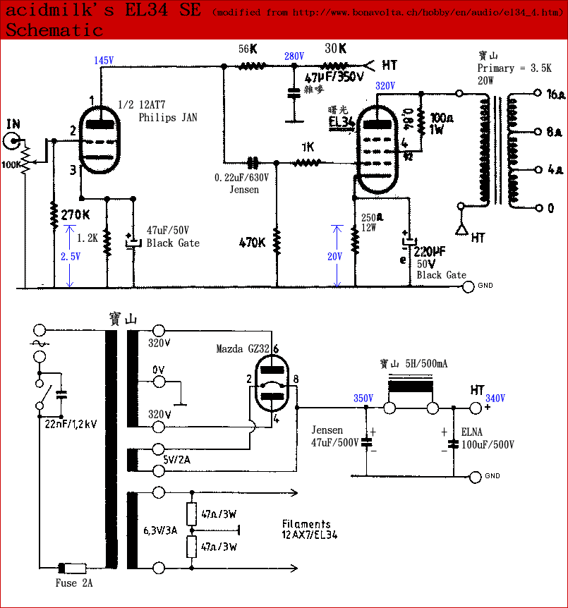 电源牛、输出牛都是香港宝山出品,电源牛港币350元,输出牛540元一对,5H/500mA阻流圈120元,香港来说是很低价的货品,口碑也是一般,小弟除了梁氏的牛牛外还没有试过其它牛,这些牛对我来说表现还不错,高、低都很好。 整机外观: 机壳 电源牛 制作过程1 制作过程2 内部接线,有点乱,不过信噪比还可以 换上kt88后的样子,感觉不好听,我没有调整,就这样插上去试,不好听可能是因为工作电压不适合 KT88,不过我对 KT88 的印象是比 EL34 来得慢,而且可能因为低频比较饱满的关系,高频比 EL34 来得含蓄,而我就比较喜欢 EL34 的取向。 我用的箱子,这对 Klipsch Heresy 箱子是从eBay拍卖来的,因为香港几乎找不到人用,亦没有二手,买之前都是从洋人讨论区得知它的声音取向,当然再加上自己的幻想啦,好彩回来后没有失望。94db很易推,现在我有一台Motorola 单端 EL84 三极接法,推它出来的人声、吹口质感很好。 我上一台胆机是梁氏的KT88推挽,也可以兼容EL34。比起那一台推挽,现在这台单端的声音还更鲜明,尤其是中高频的开朗感觉,比起那一台好得多。我也试过并联管子,12AX7 及 12AT7 都用过来并联,但中高频总是较化不开,半支 12AX7 我也试过,但频宽不太够,用 12AT7 就不错。我也问过一些洋人意见,有人建议用半支 6922 已经足够推动 EL34,而且频宽会更阔,但我还未试,因为感觉 12AT7 已经很不错。 我有一台 EL84 单端三极是用半支 6922 推动,感觉也很好。 电路图,参考网上的电路,我作了一些简单的修改,图上标的为我实测的电压值。 这是我目前的EL34单端三极接法的工作点,看图好象还算是理想,如果要上到400V以上反而不太好,如有错误请指教 (责任编辑:admin) |