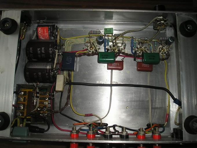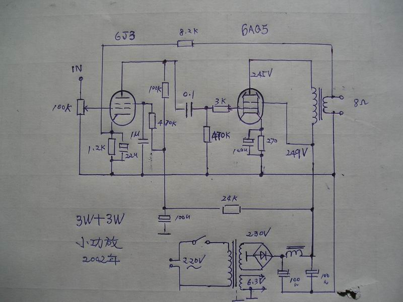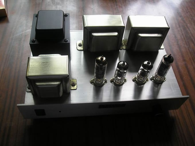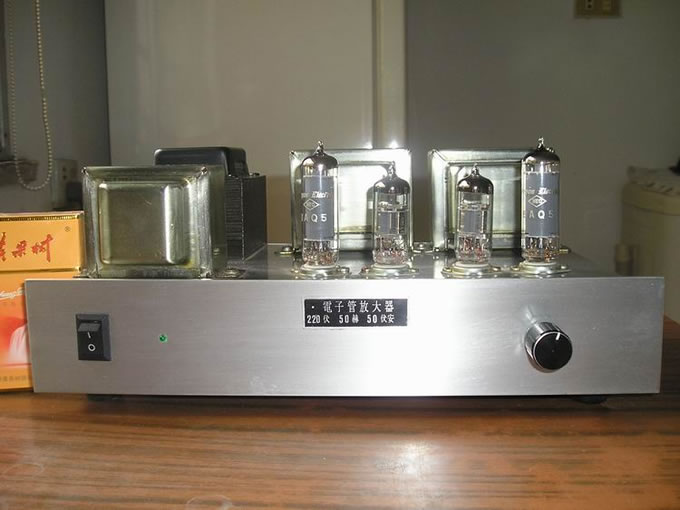 这是几年前制作的全部采用小七脚胆的小功放,功率胆为美国产6AQ5 ,电压放大为6J3 ,电源牛容量40伏安,两只输出牛用25W线间变压器的铁心精心绕制 ,机座由几块铝板拼装后,再用细纱蘸水直线打磨,颇具拉丝纹的感觉,扼流圈和输出牛罩也是水沙细磨,最后喷上透明漆.这样看着也挺美观. 功率胆6AQ5也是比较少见的,个头和6K4差不多,十分小巧漂亮,国产收音机里只有远程牌九灯转播机,和TY--50B型40W扩音机里才可见到它的踪影. 另一个角度 机内布局 电原理参考图 在此鸣谢suhui弟无偿赠送两对日本产6AQ5 ,图中左起1,2为6AQ5 , 第3是6P1作个头比较 ,4是不久前不慎碰坏的一颗美产6AQ5 (责任编辑:admin) |