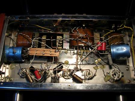 一旦所有需要的工具、材料和元件都到位,我们就可以动工了,考虑到可能有朋友从未焊接过电路,所以这里的部分步骤会详细一些。建议大家对照着前面的电路原理图阅读下面的步骤,以期真正地从电路图过渡到实际电路。 焊机的过程简单说来就是先用粗铜丝搭起一个框架(实际上这个框架也同时作了地线),然后将各器件直接焊接或者通过焊接连接线来完成管座、变压器、耳机输出插座和地线(框架)之间的,而整个电路通过电子管管座与电子管管脚连接;大致顺序一般是从前到后,也就是电源、前级电压放大和后级功率放大。直到完成了所有的焊接之后,我们才会把电子管插上,然后通电开机进行测试和调整。 笔者先给出焊接完成后的机器内部照片(由于焊接中的临时状况,图片可能跟表述稍有出入):