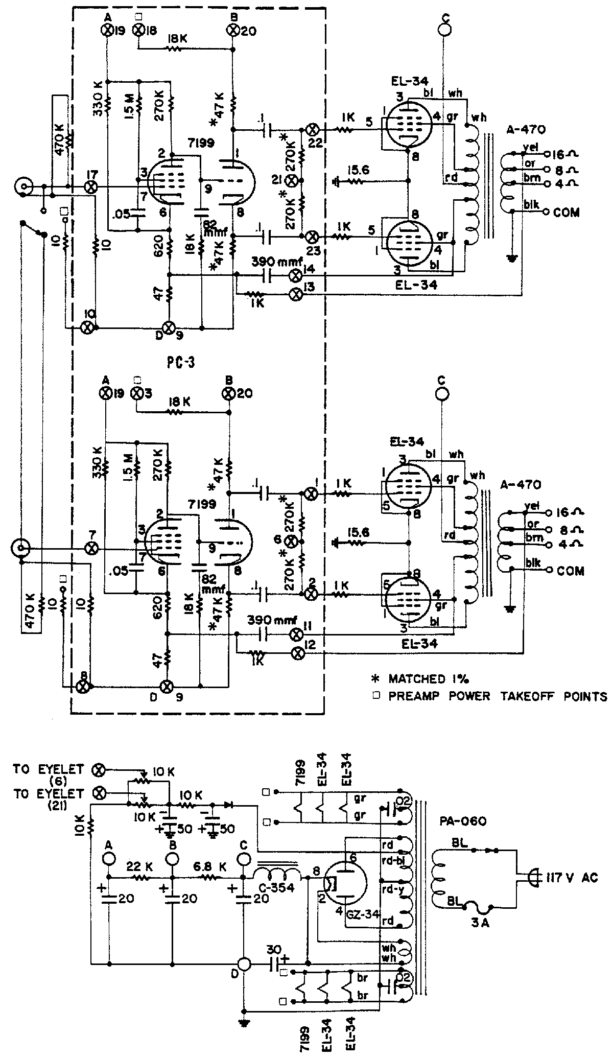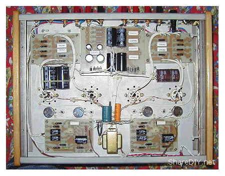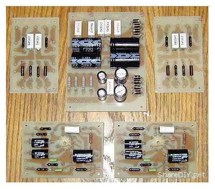 一个偶然机会,让我接触了真空管,原因是从老爸的旧东西堆中,看到了一只有脚的玻璃管,加上对于那种发出微微橘光的魅力,引发了我对这玩意的兴趣。然而对于身为医学院学生的我,要拿起烙铁来焊东西真是难上加难,但这种挑战性却引发了我不可收拾的兴趣。尤其本身是学生的我,想要接触动辄数万元的厂制胆机,是个不小的负担,因此这也成了我想要DIY的另一股动力。于是我开始多方搜集资讯,从基本的电子学到线路的决定,工具的采购,零件的购买,以至于组装、试验、试听,这一路上的心路历程,充满了惊奇与成就感,而当成品插上电,胆灯丝徐徐亮起时,那股感动真的难以形容。成功开声的那一刹那,我听到了我想要的声音,我了解这就是我想要的,这种感觉是胜过花数万元购置厂机的感动,现在就和大家分享一个初学者砌机的历程。 在透过网路以及相关的杂志寻找后,终于在数个方案中,决定了这个线路,由于线路简单的因素,加上此线路的名气也不算小,声音表现明快,力水充足,低频控制力良好,于是采用的Dynaco ST-70线路,如下图。 原装机器 ![]() 电源部分如下: 本机每声道采用一只6U8A三级五级复合管作为输入放大级及导向级,二只EL34功率管以推挽方式做功率放大,输出功率约30Watts。 零件搜集时,最让我感到困难的地方便是输出变压器。经过许多网友的指点,知道在台北地区的一些贩售音响电子零件的店,都有许多的选择,于是隔天立即搭上火车,背个背包往台北前进。由于我手中只有这些店家的地址,加上台北人生地不熟,一踏出火车站,就搞不清楚东南西北了。索性在便利商店买了个台北市街道图,开始了一天的「苦行」采购。 然而,对于一些小零件,例如:真空管、电阻、交连电容、滤波电容……等都还不是问题,电阻部分我全数使用Holco及Dale电阻,交连电容则使用了MIT、Solen及WIMA,EL34管为JJ的产品,6U8A则为美国Sylvania,机内配线全为铁弗龙镀银线,这些可能算是不错的零件了吧!(我也不是很了解,大多是从网路及杂志得知),全部大约花了三千多元。然而问题来了,一颗进口的输出变压器,动辄四五千元,电源变压器一颗就得五六千元,如此一来,光是变压器部分就得花上近一万五千元,虽然我知道输出变压器是一台胆机的大部分灵魂,然而光砌一台机子的材料费就得近二万元的开销,实在不是一个学生可以负担的,况且对于一个初学者而言,是否能成功都还是一个不定数,这真是个满大的难关。 于是乎,我决定另寻方向,希望能找到更经济的方案。辗转得知国产坚新变压器是个不错的选择,而且价格较进口货便宜,于是再度到台北寻访。经亲临结果,价格仍然超出预算许多。另外听友人说在台北洛阳街附近有几家变压器厂有接受订制,而且价格不高,但品质参差不齐,得小心询问。经多家比较之后,终于下了订单,一个电源变压器加上二个输出变压器,总共二千多元。 电源变压器的规格为: 110V : 280V-0-280V 500mA 3.15V-0-3.15V 5A 二组 0-50V 200mA 输出变压器的规格为: 5K : 0/4ohms/8ohms/16ohms 50W 机箱的部分,采用3mm的铝板,弯成ㄇ字型,上头经钻床挖孔,表面喷沙处理,左右二侧另使用2mm不座钢板也折成ㄈ字型,并攻牙以供上下锁螺丝固定用,使用不座钢板的原因是因为铝板太软不适合攻牙。底板亦使用一片3mm铝板,左右二侧再加上木板装饰。 机箱的制作是最花时间的,费了九牛二虎之力,四处经朋友介绍商借相关机器、工具,终于完成了。 将管座,变压器及相关端子、可变电阻等零件锁上后,就成了上图的样子。接著就是内部线路的部分了,由于没有搭棚的经验,所以想要用制作PCB板的方法,将全机线路分成五个部分,最后由五张板子组合而成。对于一个初学者而言,由一张线路图要转为实际的布线方法,真的是一项挑战,小弟前前后后试了数次,终于将PCB给layout出来了,用的是最土的方法,我先在一张纸上做草稿,然后利用Paint Shop Pro在电脑上画出来(就像画小画家一样),然后印至投影片上,再感光到感光电路板上,洗出PCB板来,将零件一一插上后,就成了下图的样子。 下载PCB板:电源(上排中间)、上排两侧、下排主板 再来的工作,就是接线了,将各部分的线一一连接后,将地线共同拉至等距的一点,但要实现完全等距,几乎不可能,于是我将所有地线集中于电源的滤波电容下,再由滤波电容拉至输入端接地,完成机壳接地动作。 全部的工作完成后,再次确认所有的接线无误,就是插上管子试听了,由于四只EL34管是经过配对的,所以偏压调整将VR转到底就可以获得一致的偏压。打开电源的那一刹那,心情真是粉紧张,但看到灯丝慢慢亮起时,真是喜悦,但不妙的事情发生了,就是接踵而来的哼声,好伤心啊!将过了许多天的努力,及许多前辈的指导,发现问题在灯丝的接地问题,由于采用交流电做灯丝电源,解决哼声真是一大挑战,不过老天爷还是照顾认真的人(不好意思自夸一下),终于被我运气运气的拿掉了这恼人的噪音,虽然现在耳朵贴在喇叭单体上,仍可听到些微的哼声,但只要离开单体约5CM,就听不到了,这样的宁静度,我已经很满意了。 接著我用信号产生器及示波器,分别以100Hz、1KHz、10KHz三个频段的方形波,作输出入的波形检测,发现其方波响应良好,实际试听时,高频清脆,中频饱满,低频的控制力良好,聆听了许久没有疲累的感觉,特别以阿姐鼓一片测试其动态,发现推动我那86db的二音路书架喇叭赢刃有余,暴棚力道良好,不