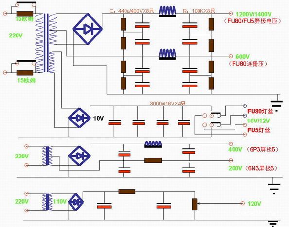 感谢P61兄则赠送的机箱和推动牛,感谢闲不住兄提供的廉价输出牛,感谢lalalao老师赠送的音箱,感谢200B帮制作的屏帽。经过一年的努力,我的FU80终于出声了,希望大家能和我一起分享我的快乐! FU80这管子所发出的声音真没让我失望,不知道用什么词来形容它了。 来张放大点的图片! 篮光猫眼。 内部布局。 把作这台机器所用的材料介绍给大家,基本上都是廉价物品,两台分体单端的总造价不超过800元。 我把电路给贴上。 其实电路也没有什么特殊的,输入部分用了一个霍尔曼电路,其它的就是照着电子管手册和曲线图做出来的,全部为直流供电,用了3只电源变压器,3只扼流圈,8支整流管。 下面是电源电路,由于FU80灯丝电压是12V而FU5的灯丝电压是10V,所以我在220V输入部分串了两只50W的电阻,把开关并联在两只电阻上,当开关断开时,加在电源变压器上的电压正好为200V,灯丝输出10V,高压为1200V。 当开关闭合时,加到电源变压器上的电压恢复为220V,灯丝输出变为12V,高压为1400V。其实实际电路里面还用了两只继电器来控制各开关的通断。 (责任编辑:admin) |