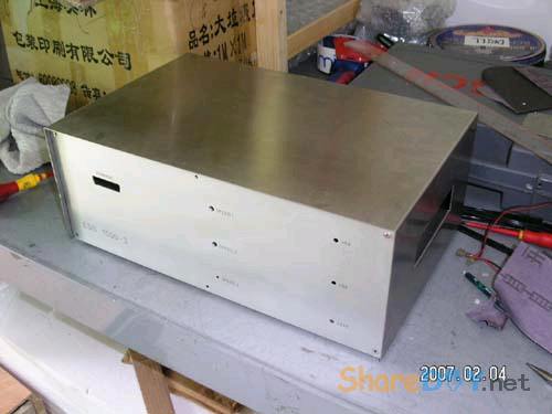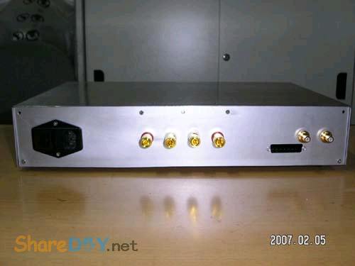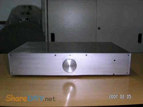电位器用了ALPS八脚电位器,装好前后面板后如下图:(后面板上那个并口孔又是个缺陷,真想找个并口接上,再在里面加个并口通信板,用电脑控制胆机。。。。。。)