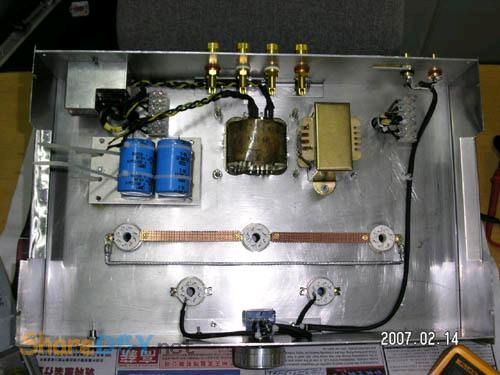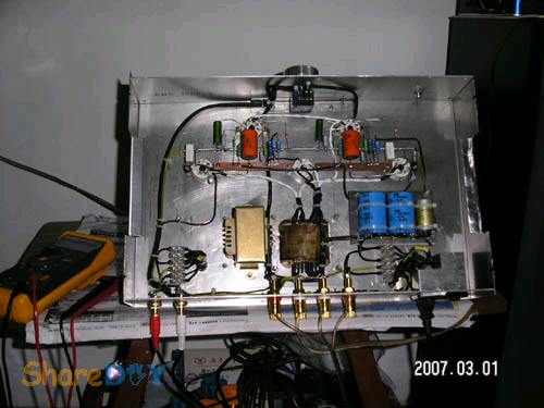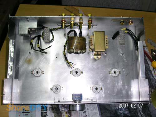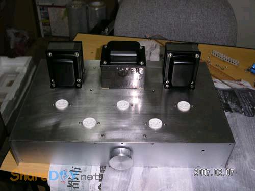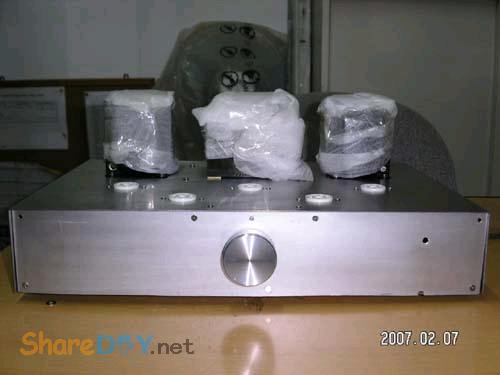 机子早就做好了,只是没有时间写装机过程,一直拖到现在...... 本人一直在论坛上潜水学习,为打造自己的第一部胆机而准备,材料都是在网上邮购的,电源牛200W,输出牛13W,曙光的6N8P-J,和6P3P-J,整流管用5Z4P。材料和电路都确定好了,就差一个机壳了,本想