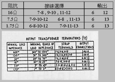 而老西電124B機的輸出牛171c同是可將獨立四組1.75 ohm次級線圈靈活運用圖(5)。若在低阻抗1.75 ohm,輸出時,應將四組1.75 ohm全並聯,以取得最低內阻和最大電流量。西電輸出牛的設計處理是優於絕大部份的音響廠家,通常大多數膽後級的輸出,一般廠家多以固定的繞線處理法,即4 ohm、8 ohm、16 ohm等。 若單是使用最低ohm的4 ohm時,那麼8 ohm和16ohm就是空置的;而西電很大好處是即使接駁1.75 ohm時其輸出牛的次級可以完全的使用,可算物盡其用,且能提供最穩定和低內阻的輸出,因此對阻尼系數damping factor就大大提高,這是西電輸出牛的很大色的優點。線路圖下部的輸出牛接線表,印刷是相當模糊,不易辨認接線的數字編號,筆者祇有憑經驗與淺見,試行將最常用的輸出阻抗接線法簡略的描述下來,包括1.75 ohm、7.5 ohm、16 ohm,請看如下圖(6):
