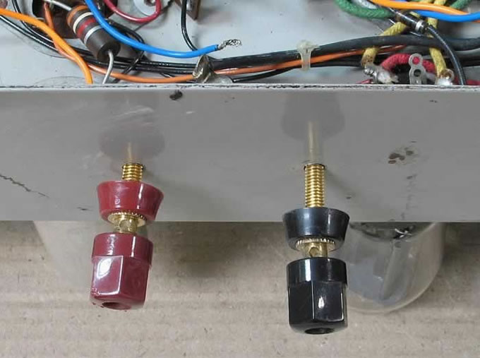 (二) 喇叭接線位:這KS-16608雖不算太老,是約70s至80s之間面世,也算為古董機,它的喇叭接線位仍是古老式的螺絲接線排,若你想接上現今的Hi-End線ZU Cable或Audioquest的大叉,就是極度的困難;若接上幼小的西電綿布線就容易得多了。可惜的是,機主潘兄在買機時已被改了新裝的金接線柱,看圖(6),更糟的是在機身鑽了孔;就大大破壞了原裝機殼的「原味」感覺,另外錯的是前改機的大師竟然沒考慮,鑽上這兩小孔(太細)是有可能會令這金接線柱在機殼短路,或許!他安裝時是未短路short的,而落在潘兄手中就short了,於是短路的那一台是不尋常的細聲,是在short與未short之間形成低ohm的電阻;幸好還未燒毀輸出牛,是可慶幸!經了這孝驗,也表現得出這西電機的能耐寬容度是強的!眼見這不妥善的情況,當然第一時間要解決!既然已鑽了孔,不妨將錯就錯的將這兩小孔由4mm再鑽大至10mm,可以裝得上真正靚聲的OFC紅銅接線柱,而又能輕易接駁新一代的大蛇喇叭線,看圖(7),由原有的喇叭螺絲接線排處引線到這粗壯的接線柱,這摩機師是用含銀的telfon線,是新一代的科技產物,顯然是新舊兩派的不相配;圖(7a) 兩派的比較。若換上老西電綿布線,就襯到絕了!而且聲音亦合拍。