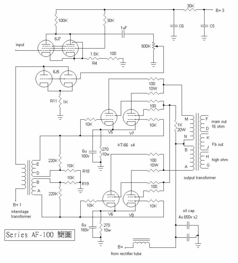 所以若將這GEC AF-100作後級使用時,第一個手術是必須將輸入牛抽離,而將輸入訊號線直接銲到6J7五極管的柵極(柵極帽)處,還要加上500K的輸入阻抗電阻。