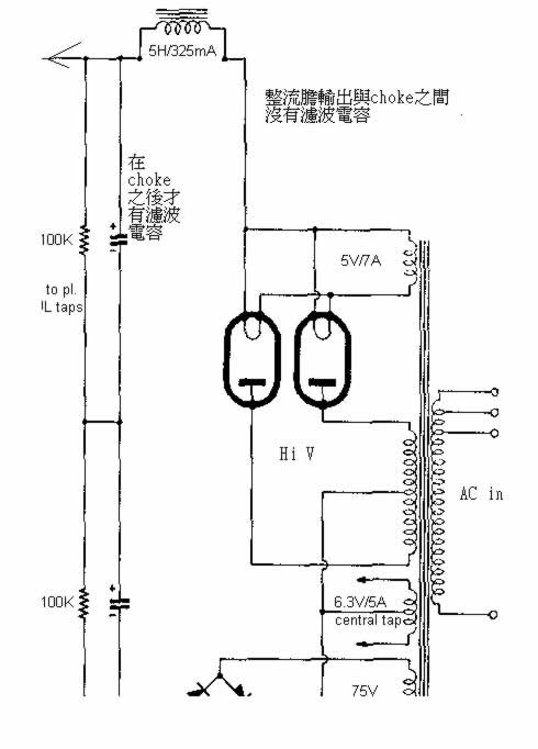另外一點是高壓膽整流後與扼流圖(choke)是沒有電容濾波的,在choke之後才見濾波電容,請看附圖(5)雖不是GEC原廠提供的圖,但因結構是相同,可供參考之用,這樣的電源處理通常只會出現在「高信賴度」的專業儀器上,只因要求整流後的直流電源穩定高,同時亦借助扼流圖(choke)在未濾波前所帶的電源噪音(雜波)過濾,雖然在能源效率轉換方面較低,這機的電源牛高壓是500V x 2,若在choke前加電容,即一般的濾波方式,直流電輸出可連550V至600V左右;但現在只有400V DC而已,是為了穩定度和電源質素高的緣故,這理論用在音響上是優勝於複雜的穩壓電路;另方面講這扼流圖的質素正又操縱了聲音表現的很大部份,因選擇靚choke是很大的難題。在現今的音響廠家已完全放棄這做法。