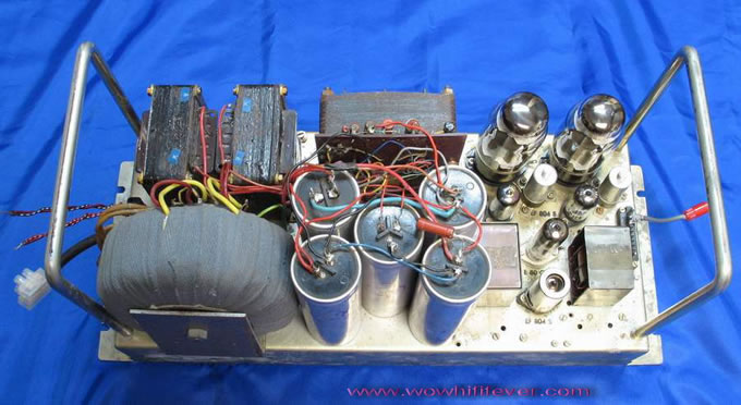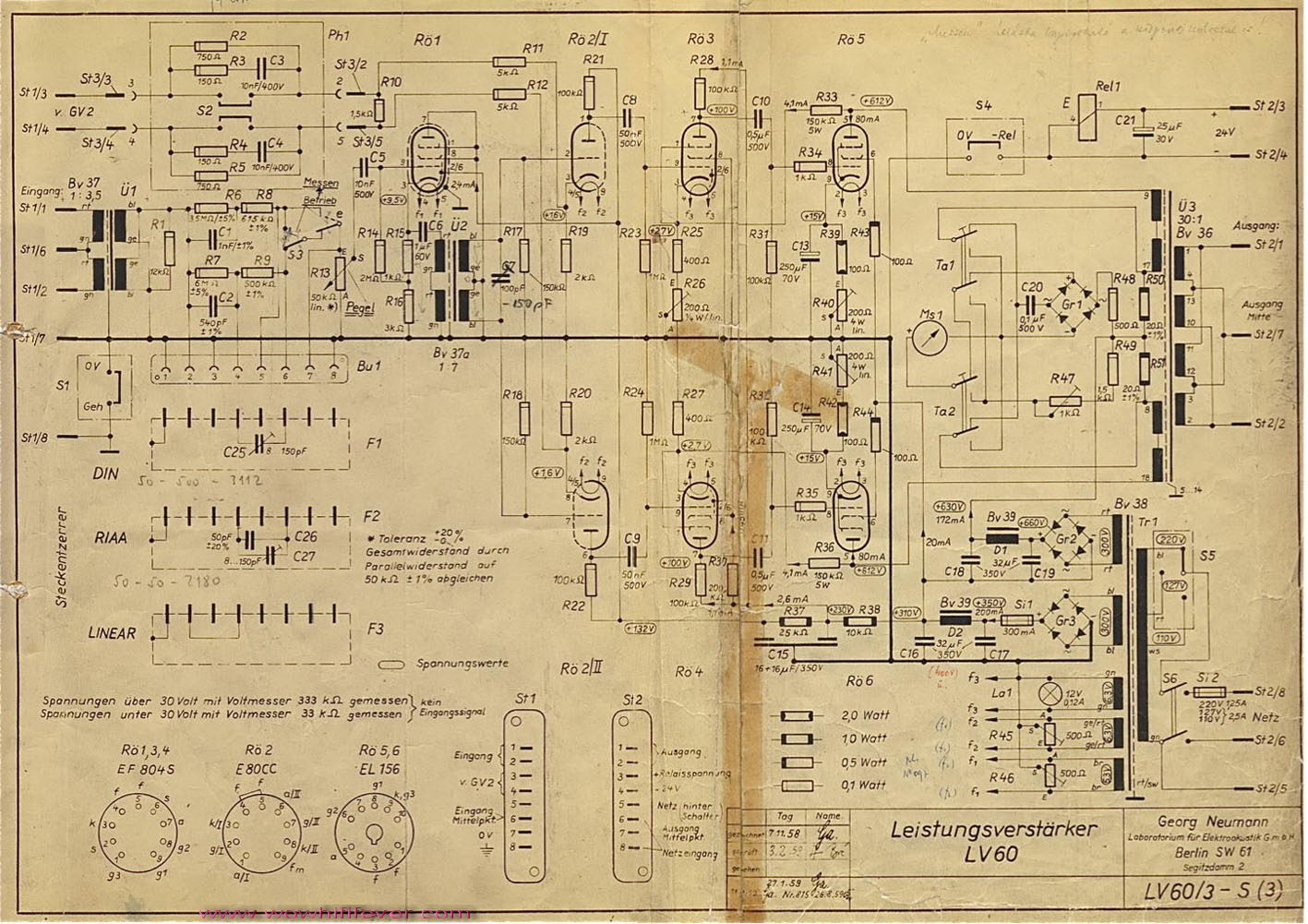 這機還有一些設計特色是全對稱式放大線路,亦有稱為 “ 鏡影式 ” 對稱,再配合使用交連 ( 分相 ) 牛就是最完整的 “ 平衡式 ” 放大。若 LV60 單獨作後級使用時,應使用接線位 BUI 的 “ 7” 和 “ 8” 作輸入。假若使用原配前級 GV2 ,可使用 ST1 的 “ 3” 和 “ 4” 接線端作輸入。前級 GV2 是平衡輸出的,因此可跳離輸入管 RO.1 和分相牛,前級 GV2 可直接推動 RO.2 / E 80C C 雙三極管的陰極位置,這也同是全對稱的原配組合,亦不會因重覆了某些放大部份而令整體放器的增益過高,是十分巧妙和花心思的設計;正好給我等後人從著參考他們的設計精髓而獲益。