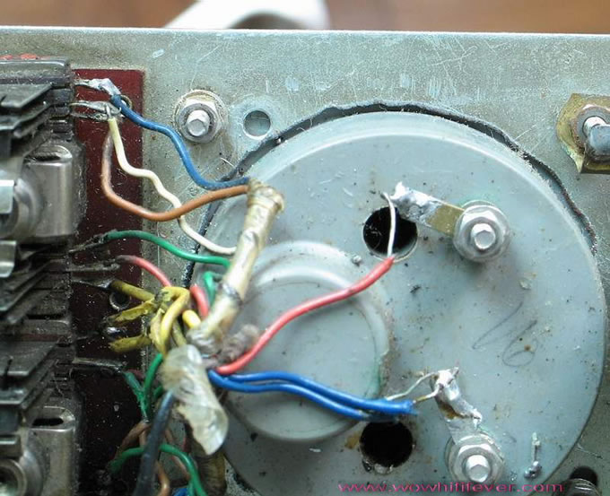 下一步,試推測是否可調陰極電阻未調至合適的數值,看 圖 (6) 這後級正面設有測試功率管電流量錶,我們暫且不理會這電流錶的可信性,再看仔細發現這電流的安裝技術是十分差勁,看 圖 (7) 懷疑非原裝的量錶,當然可信程度也大打折扣,看線路圖 所示 R05 和 R06 的屏極電流應是 80m a , 先量度陰極電阻 R39 和 R42 這兩枝陰極電阻 100 Ω按歐姆定律公式: I 電流 = V 電壓 ÷ R 電阻,因此這電阻間的電壓應是 8V/D C 。即是,當量度這陰極電阻 100 Ω 是 8 V 時,每只功率管的靜態電流正是 80m a ,但在這後級來的量錶所顯示祇有 30m a ,因此誤導了用者將電流調至危險程度也懵然不知,純是早於來機時那改機大師的妄顧安全所至,應戒之!