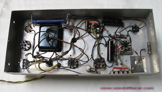 基本上主要必須修整的已接近完成,初試啼聲 推動 Jensen12 吋勵磁喇叭,在所有零件仍未經煲開聲的階段,已叫人心往神怡、美不勝收、叫人不願停下去。還有一件事仍令我耿耿於懷的是這安裝在機底內部的輸出變壓器,憑經驗估計,這 Wurlitzer 是未玩盡的,看這輸出牛無遮無掩、無鐵殼 housing 、坦坦蕩蕩的真面目示人 圖 (15) ,當然設計者是藝高人膽大 、 頗有膽色,這樣處理手法對聲音更是坦蕩無束縛之感;況且也沒必要修飾外觀。假如再動動手術,將這輸出牛放在機的頂部,令它得見天日,呵呵!將必然是更精彩啊! 改機或修理機,可從過程中學得或體會經驗。 看 圖 (16) 若放在機底內或頂部同是有足夠給輸出牛安身之處,將頂部的名牌移於在前面,按步就可移動輸出牛了。不足一小時就可完成這移位手術,急不及待開聲,一聽果然原有的聲音優點保留,多得了幾分出塵脫俗、清新可人的氣質,人聲之生動及小提琴詮釋出帶有靈氣的音樂。量度儀器,頻率由 15Hz 至 30kHz ± 0.5db 已完全超越電風琴的音頻要求;我們不必先入為主地看 Wurlitzer model 6420 是電風琴的擴音,在自已想像中給它 50Hz 至 5000Hz 的預設頻寬範圍, 圖 (17) 看示波器正弦波的曲線弧度和方波的凌震,已知其頻寬闊度與泛音的重播能力是非比尋常。輸出牛是重要的聲音零件,在物理學 微動態諧震方面,放在機箱內產生混濁的聲箱效應共鳴,若將它移放在機頂,即是將它脫離混混噩的環境,當然精神為之一振,是易於理解的。筆者也曾在少數資深發燒友會中,將這台機的電源牛頂蓋移去,聲音也是豁然開朗,讀者若有足夠技術或膽量,又能易於安裝回原狀者,不妨一試。 圖 (18) 已完成手術的 Wurlitzer model 6420 內部圖。