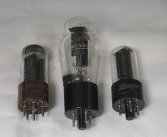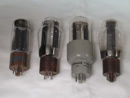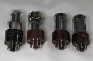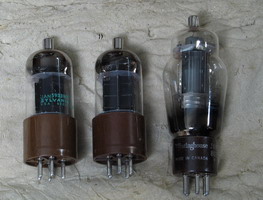 圖 (16) 最左邊的是 ECG Philips 5R 4G A 是圓形除氣環 1986 年製造, Philips 一向都是 OEM 買膽的公司,憑結構看它是美國 Sylvania 的產品,聲音比現今製造的俄國或祖國為好。圖左 2 是葫蘆形的 RCA ,在美國膽來看,葫蘆形的膽通常是高班於直身的膽,這 RCA 比 ECG Philips 為厚潤、音樂感豐富一點。圖右 2 Tungsol 5R4WGB 有厚厚的大膠底座,仿如雪糕杯的形狀,出生於 1961 年,膽盒上印了 MFD. BY Chatham Electronics , DIV. of Tung-Sol Elect. INC ,即是製造廠是 Chatham Electronics , Chatham 在美國一向是生產軍用零件和膽的。這 5R4WGB 製作相當認真,聲音比起上述兩款膽為高貴,而且動態通透度與音場闊度也勝出於它們,如果以港幣 $300- 左右一支的零售價,可說是超值 best buy !最右邊的是英國 Brimar CV717 雙圓環除氣環,它有英國傳統的音色、中音優美音頻流暢,音色相當討好,這灰屏的 Brimar 5R4/CV717 對著黑屏的美國膽,看來黑屏並沒有甚麼必勝把握, RCA 和 ECG Philips 落荒而逃,祇有 Tung Sol 雪糕杯 5R4WGB 仍有一招半式招架得住, Brimar 贏甜美的音色, Tung Sol 就以動態、樂器件頭明朗和實在感勝一籌,可見兩國文化之不同。