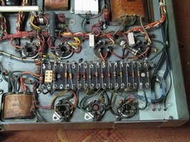 我們看見的電源變壓器 ( 電源牛 ) ,除了在量感方面是超重量之外,結構性的線圈組正是它最大的特點 圖 (6) ,獨立多組高壓和燈絲線圈 。專業器材在特性測試上往往重視可靠和耐用;至於專業機輸出牛的音頻響應,通常是超越 HI FI 機的要求。看線路圖右邊是電源供應部份,有兩個整流管: 5R 4G Y 最高壓部份是單獨供應電源至一對功率管 807 的屏極。 5Y3 是供應電源給輸入放大管、推動管和 807 功率管的廉柵極之用。值得注意的地方是專業擴音機所用的,功率管屏電壓往往是比民用機為高,同時又能達到穩定和耐用的要求,這就是藝高人膽大?或是在設計上顧慮週詳和巧妙?不少初學的土砲友有常畏高症,是因為未全了解膽的特性;就是屏壓可以很高,而廉柵壓不能高。就以本機所用的 807 作為例子,如果廉柵電壓是 400V 的話,屏極不能高於 400V ,若 807 的廉柵電壓是 300V 或以下,那麼其屏壓可高達 600V 也仍算是安全。