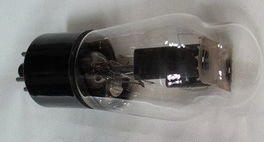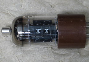 上兩期我們討論過一般 807 適宜用於會場廣播或發射用途,與 807 相近而特性可互代的特殊高品種 5933 ,音質全面優勝於 807 , 圖 (10) 外觀比較。 圖 (11) 啞黑屏而有兩個孔的 5933 是為上品,請參閱前文。 6SL7 是倒相兼放大的管子, 圖 (12) 四支 6SN7 同是美國古董膽,圖右邊兩支紅腳 RCA 5691 是美國早期出產的特殊靚聲品種,在美國境內它是地位超然,聲音跟一般的 6SL7 相比,例如圖左兩支 Sylvania 6SL7 , RCA 5691 聲音從容自然、音場闊度與音樂感都是全面拋離其他對手,看 圖 (13) 近距離近攝的 5691 ,上端多一層雲母片,在金屬屏與雲母片之間有五支銀白色鋼骨支撐。這是一個好例証,說明美國人造膽,很容易給人在外觀看其結構製作或多一些製作物料,就可判斷其質素的班級;但是歐洲膽就不能憑其結構或黑屏去分辨級別了。這 AM1080 所用的 6SL7 是比較低工作電壓和低損耗的位置 ---- 而又對聲音影響較高,所以用較高質素的 6SL7 是應該的。