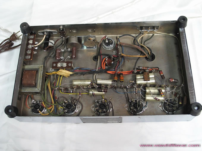 第二步:將機內近在兩隻 400Ω線電阻的金屬片鬆了螺絲,這金屬片移開一點,就可分別用萬用錶的紅棒量度這兩點 test point 圖 (16) ,調校平衡 balance 電位器,可調得這兩測試點達到相近電壓 ( 約 40V) ,這是真正有效的測量功率管電流平衡。此時兩隻 KT-66 的正柵壓不一定完全相同,可能兩隻 KT-66 其膽本身的靜態電流值是不相同 ( 即未算配對 ) ;其實我們要求的結果是兩支管 KT-66 真正工作流通的電流近乎相同,這正柵壓的調校目的正在此。若找到愈是接近配對的 KT-66 ,當調得兩膽陰極電阻所帶的電壓相同時,又可得見其兩膽柵極電壓接近相同,當然是好事;祗要可調得兩點 test point 電壓相同也應接受,因老期製造的靚聲英國 KT-66 得來不易呢 圖 (17) 。當完成兩步驟的調校後,最好將金屬片用原有螺絲接合回這兩測試點。