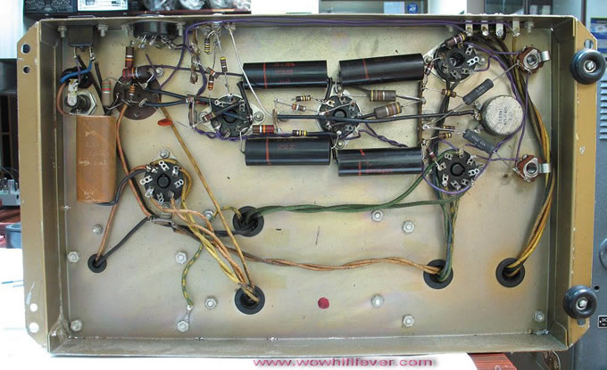 剛己提過這機的 “ 出生 ” 是廉價的套件,所用的 “ 低班 ” 交連容是預期的,建議將 Pyramid 轉換了 Sprague / black beauty 或美國油質電容,是可大幅的提升音質,看 圖 (5) 比較,右邊四顆是 Pyramid 、左邊四顆是 black beauty 。原本 Pyramid 是用 0.25u 400v ,若要依數值找 black beauty 實在太困難了;以經驗所得,交連電容的數值並不須太執著,數值是量,物料是質, “ 質 ” 確是重於 “ 量 ” 。筆者現時剛有 0.15u /10000v 的 black beauty 替 Pyramid ,果然全面勝出,無論是高低頻兩域伸展,與及中音的質感都升了幾班;當然先經了第一段的手術,降低了負回輸和拆除了高頻抑制電容,在第二步換連電容時,所得的更是痛快和喜悅。