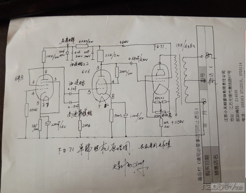 本机采用了固定栅负压用来调整功率管的屏极电流安全可靠,唯一的缺点是71的管座和管帽没有卖的,只能自己DIY了,管座采用电木板自己开孔安装813管座的夹子效果还不错,管帽也是采用805的管帽里面用镀银铜片铆制的很好用声音超靓的FD71单端胆机电路图等机器全部调试完毕再上因为有些电阻待定望谅解声音超靓的FD71单端胆机