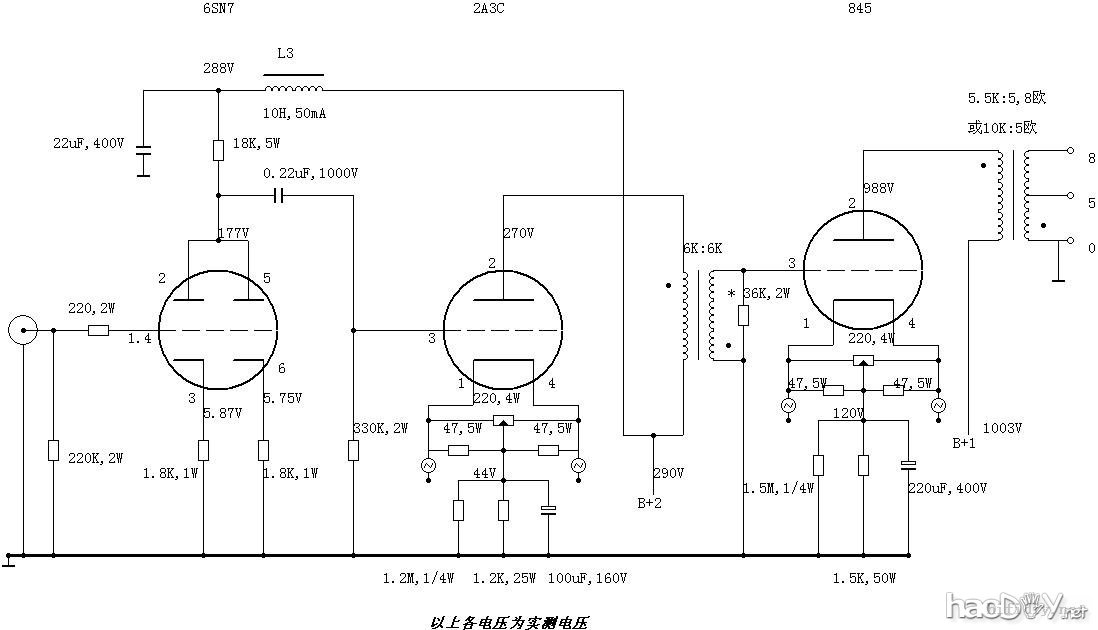 经常听烧友们讲,211、212、805、845.....这些直热管如何、如何!!特别是有位烧友如是说“真的要用天大地大来形容,那种高功率管特有的宽松感和细腻度,还有泰山崩溃前而不乱的临场感......”,说得我心里痒痒的,于是我打定主意做一套845单端后极玩玩,经过很长时间的备料和艰辛的制作,经过很长时间的日思梦想,今天终于完成了。电路形式为:6SN7(并联)+2A3C+推动变压器+845,整个制作过程陆续上传来同各位一起分享!请各位前辈指正!先上电路图,如下: