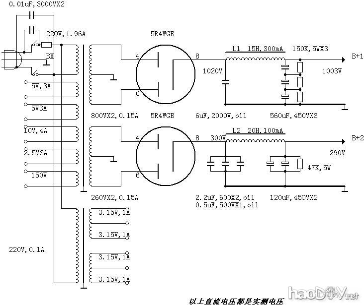 下面是电源变压器的制作:初级220V,1.96A;次级800A-0-800V,0.15A一组;260V-0260V,0.15A一组;5V,3A一组;2.5V,3A一组;10V,4A一组,150V一组。6SN7灯丝变压器一只:初级220V,0.1A;次级3.15V-0-3.15V,0.9A两组。上图片:
